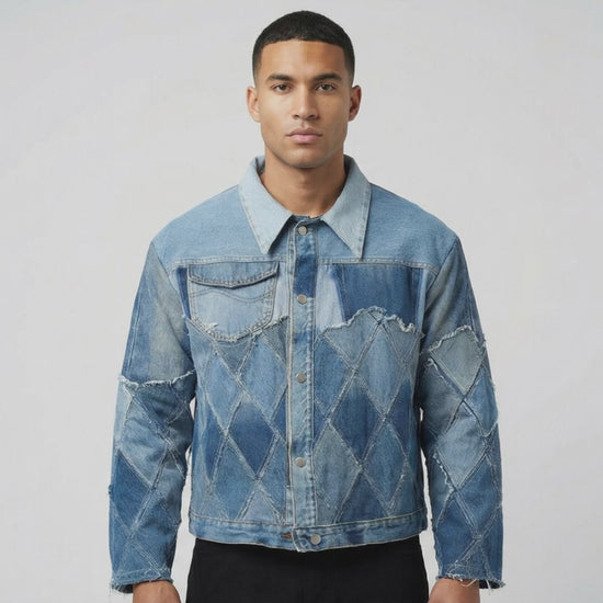 DIAMOND AMOR is a collaboration between The House of Grace Huxley and KIAT — an artist who sees denim the way a geologist sees stone. He doesn’t sew fabric. He reconstructs it. Every diamond panel in this jacket was cut from different denim — different weights, different washes, different lifetimes — and stitched into a geometry that shouldn’t work but does. The raw edges are intentional. The fraying is deliberate. Nothing is hidden, and nothing is polished away.